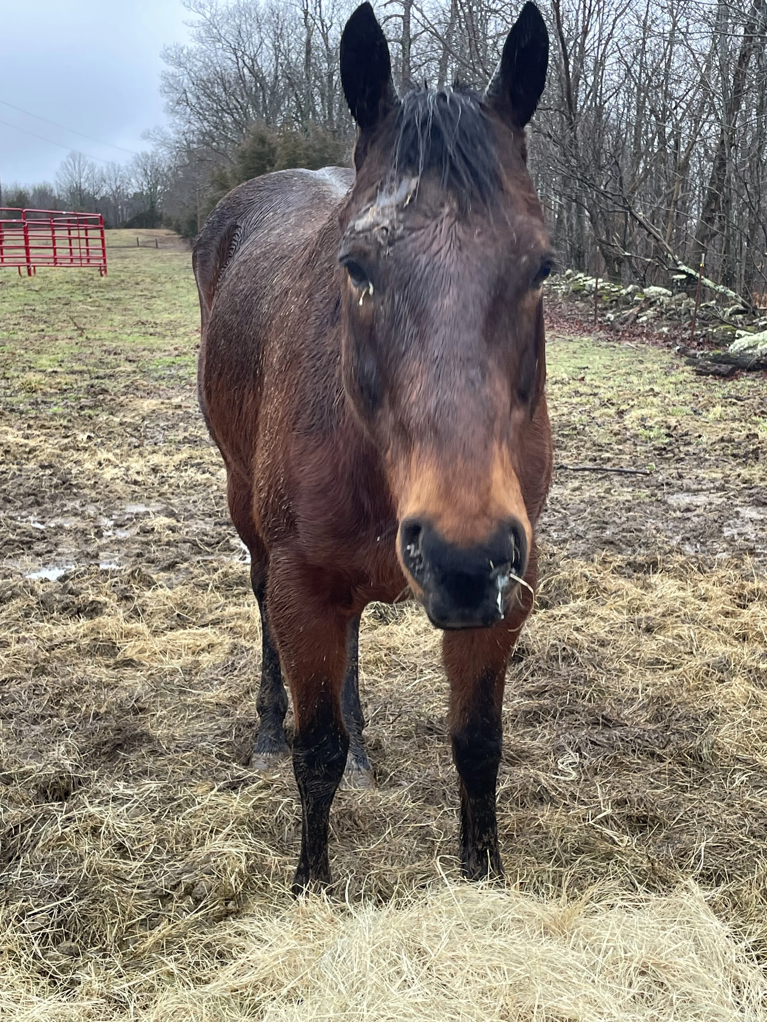Jeffrey, a nine-year-old American Quarter Horse, Bay Gelding was 72 hours away from slaughter when we rescued him. While in the “care” of the kill pen, he suffered a laceration that went to the muscle on his forehead. It, along with his whole body, was full of infection. He required aggressive antibiotics for over a month and chiropractic care to address the compression in his spine affecting his functional movement from the initial injury.